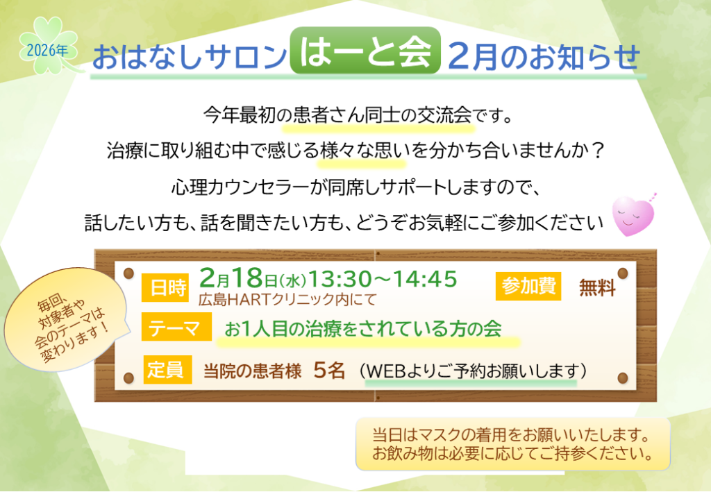 2026年1月20日 / 最終更新日 : 2026年1月20日 office お知らせ おはなしサロン『はーと会』開催のお知らせ 次回はーと会の開催日が決定いたしました。 はーと会について詳しく知りたい方は、下記ページをご覧ください。 おはなしサロン『はーと会』
